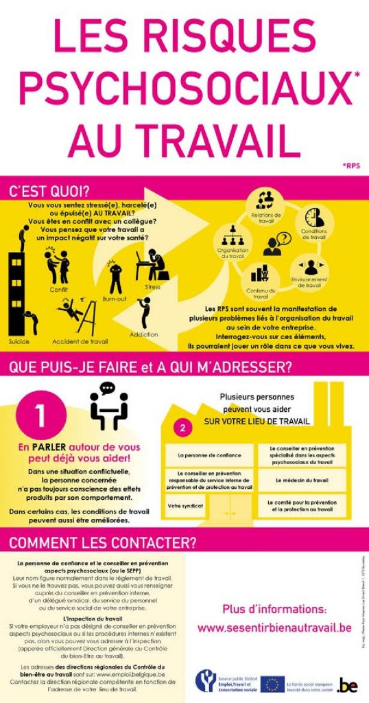 SPF Emploi, Travail et Concertation sociale, Guide pour la prévention des risques psychosociaux au travail, novembre 2017. Téléchargeable sur www.sesentirbienautravail.be.