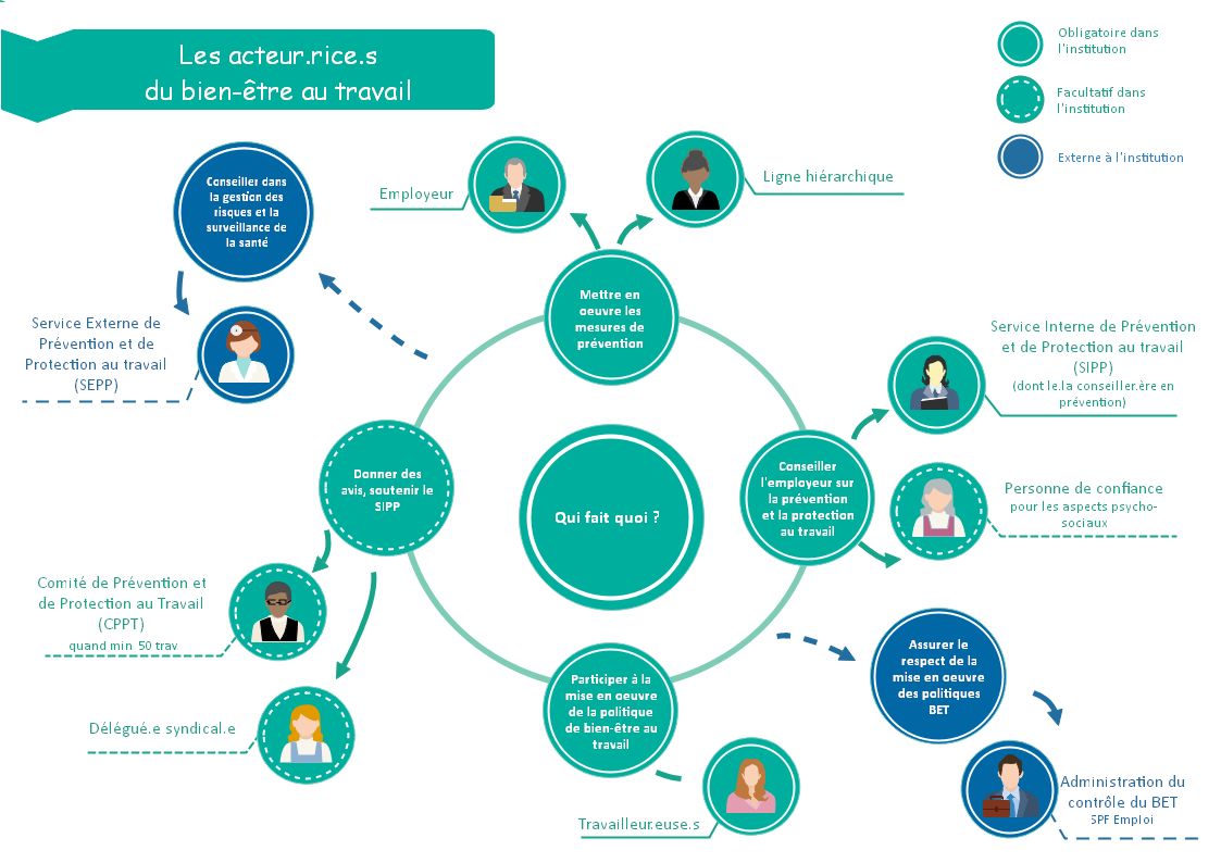- des personnes de contact en rapport avec le bien-être au travail (via le règlement de travail) : conseiller·ère en prévention interne, conseiller·ère en prévention médecin du travail (CP-MT), conseiller·ère en prévention aspects psychosociaux du service externe pour la prévention et la protection au travail, secouriste interne ;